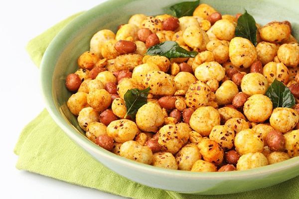 1. सबसे पहले मखाना और मूंगफली को हल्का भून लें। मूंगफली के छिलके हटा दें।